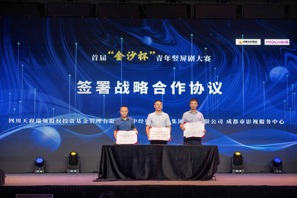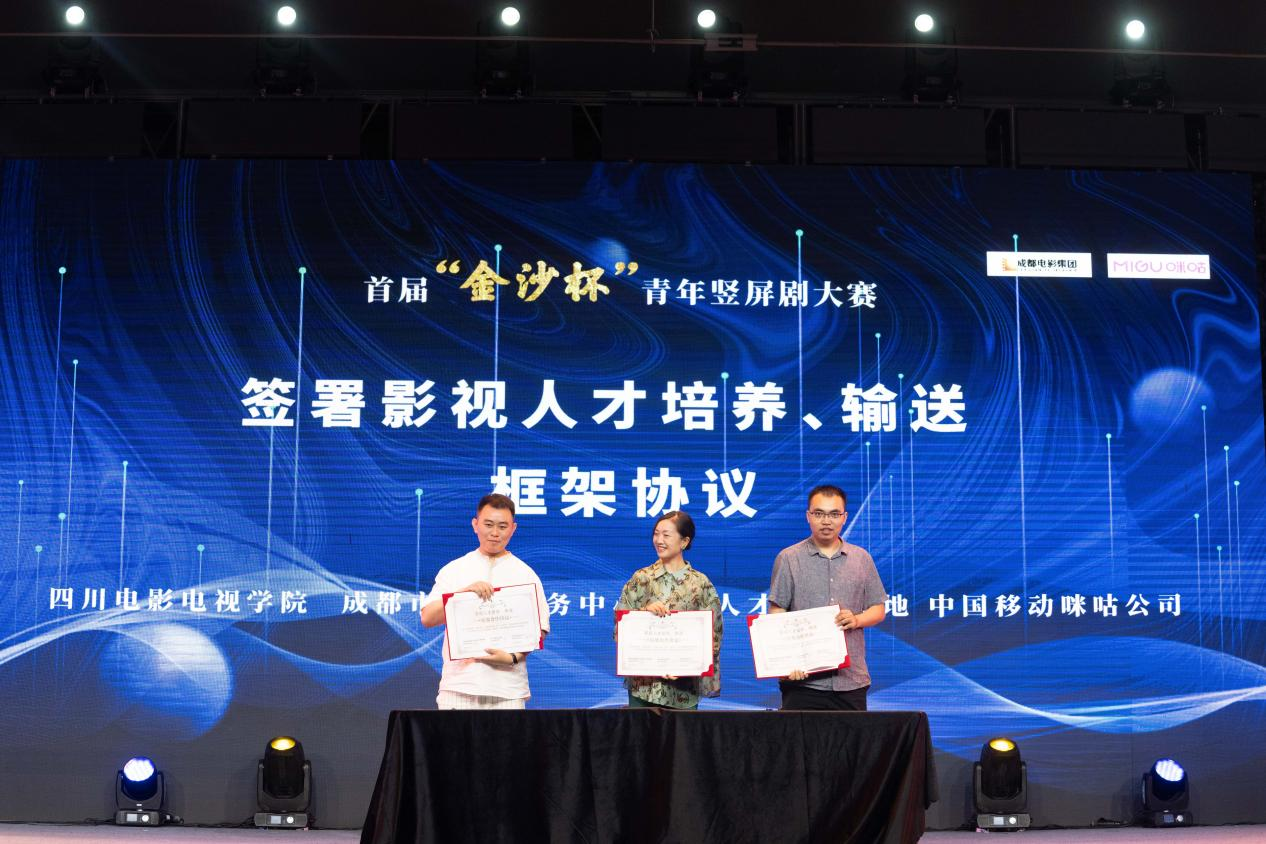 中國移動咪咕公司咕咕工作室短劇制片人黃振民 (左)、四川電影電視學(xué)院黨委副書記、副校長羅思(中)、成都市影視服務(wù)中心人才孵化基地負責(zé)人張易(右)簽署影視人才培養(yǎng)、輸送框架合作協(xié)議